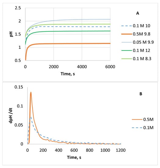 pH (A) and dpH/dt (B) depending on time and HCl concentration.