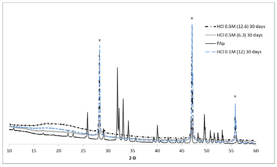 XRD patterns of FAp and solid residues after 30 days in the experiments with 0.1 M HCl (dose 12) and 0.5 M HCl (dose 12.6 and 6.3). x—CaF2 (ICDD DB card nr 00-004-0864).