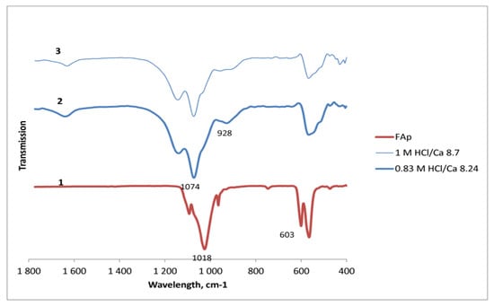 FTIR spectra of 1—FAp; 2—solid residue of experiment 10 (HCl 0.83 M); 3—solid residue of exp. 12 (HCl 1 M).