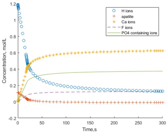Using the Relationship (11) the dissolution rate of apatite and the concentrations of H+ and other ions (Ca2+, F−, H2.75(PO4)0.25−) can now be calculated by solving the ordinary differential equation system (Equations (10) and (11)). The initial conditions are: t = 0 s: MH+ = 1.186, MFAp = 0.113, MCa2+ = 0, MF− = 0, MH2.75(PO4) = 0 (mol/L). The very first seconds are excluded as not suitable for Equation (15). The first period of dissolution, until 300 s, is used for the graphical illustration of the calculation results, shown in Figure 6.