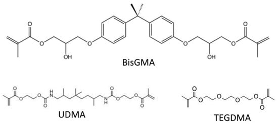 Bisphenol A-glycidyl methacrylate (BisGMA) is one of the most common resin composite monomers due to its ability to crosslink, its hydrophobicity, and the rigidity it imparts on the polymerized structure (Figure 1), though many others are also commonly used [11,12]. The reason for the incorporation of other dimethacrylate monomers is due to the high viscosity of unpolymerized BisGMA, due to its pi-pi bond stacking, and high level of hydrogen bonding. This high viscosity can both inhibit the incorporation of fillers that help to both strengthen the material and impart color on it and can also stop the mobility of monomers within the mixture, decreasing the degree of conversion of the monomers into the polymer network. Diluent monomers with lower molecular weights, such as triethylene glycol dimethacrylate (TEGDMA), and urethane dimethacrylate (UDMA), are, therefore, necessary (Figure 1). Incorporating too great a proportion of such relatively hydrophilic monomers, however, increases the absorption of water, and due to the smaller molecule size, can cause excessive shrinkage of the restoration during curing [15,16,17].