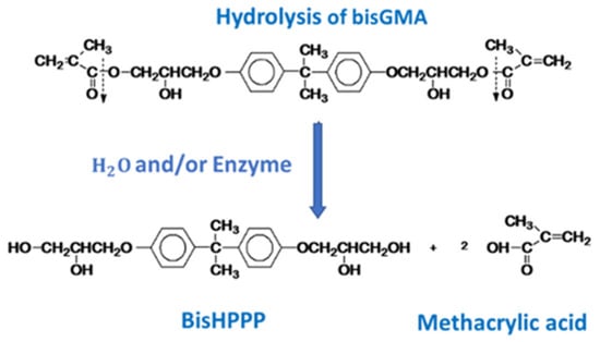 Though mechanical degradation is the most physically obvious source of the degradation of the mechanical properties of a bonding agent, it is not the only challenge the restoration faces. Resin bonding agents are inherently not inert substances, and this makes polymerized dental bonding agents vulnerable to chemical degradation by enzymes or hydrolytic conditions within the oral cavity. Though there are a multitude of possible sources of this degradative stress [33], one significant vulnerability of these polymers is that the ester bonds of the methacrylates can be hydrolyzed in the presence of water (Figure 4) [10].