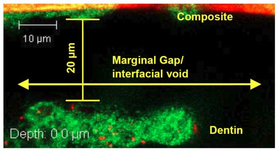 In both self-etch and total-etch systems, the application of the bonding agent results in the formation of a region known as the hybrid layer, where resin monomers interdigitate with the dentin’s collagen network (Figure 3). The hybrid layer, or resin-tooth interface, is generally considered to be the weak link of the restoration, as it is the key to the mechanical viability of the restoration as a whole, anchoring the restoration to the remaining dentin or enamel, and functioning as a stress-absorbing layer to allow the restoration to withstand mechanical stress [11,18,25]. This hybrid layer is vulnerable to degradation from a variety of sources. Often, a marginal gap forms between the composite and dentin, thus allowing saliva, bacteria, and neutrophils to penetrate the hybrid layer in a highly complex, synergistic process [26,27].