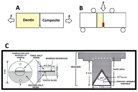 Due to the possible variability in bond strength, due to differences in specimen geometry and unequal stress propagation, it may be best to test the material’s resistance to crack propagation or initiation; effectively, its resistance to fracture or fatigue [10,57]. The formation of a bonded interface can be considered to be imperfect, with flaws inherent in the process of curing [60], and it is the formulation’s tolerance of these flaws that is most likely the key to restoration longevity. These measured values should be more independent of geometry or testing modality. It is for this reason that the analysis of the fracture mechanics of bonded interfaces is seen as a valid means of measuring changes in the adhesive [59,60]. The plane-strain fracture toughness (KIC) is one such variable, measuring the critical stress value at which a crack will propagate and, by extension, the interface will fracture [55]. The testing of bonded interfaces is highly complex and variable, with many different types of specimens, and methods of testing; however, the most common methods of testing are the variations of the single edge or chevron-notched tests, and short rod Chevron notch tests in order to calculate KIC for resin composites (Figure 6) [61]. Such stress to fracture tests, wherein the load is slowly increased until the material or interface fractures, are common. However, these methods have been criticized primarily due to the observation that this kind of steady and unending increase is not representative of the clinical situation [62]. This is somewhat of a mischaracterization of the intent of these tests; the results are still valuable, as they are used in directly determining changes in the breakage resistance due to the biochemical degradation that causes interfacial flaws, as they can be used to represent the integrity of the bonded interface after aging [63].