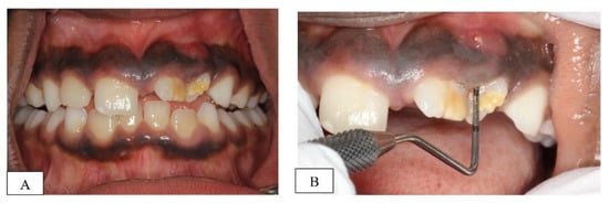 (A): frontal clinical view of patient’s dentition at initial assessment, (B): closer view of the hypoplastic teeth (21&22) showing the labial sinus tract and the increased probing depth (9 mm).