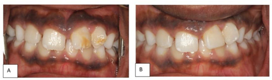 Following complete eruption of the affected permanent incisors, aesthetic restorations were provided with light-cured composite (Z350; 3M ESPE, St. Paul, MN, USA), using a minimally invasive cavity preparation (Figure 5). The aesthetic improvement re-established the patient’s self- esteem, and controlled tooth sensitivity. The patient was then referred for orthodontic treatment for correction of the malalignment.