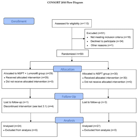 This interim report includes 59 consecutive patients of a total of 200 patients that shall be recruited for the entire clinical trial. Figure 1 shows the CONSORT flow diagram reporting the enrolled, treated, and evaluated patients. For the interim analysis, there were 24 patients in the NSPT + Lumoral®-group and 27 in the NSPT group. Any subjects over 18 years old were eligible for recruitment according to the following inclusion and exclusion criteria.