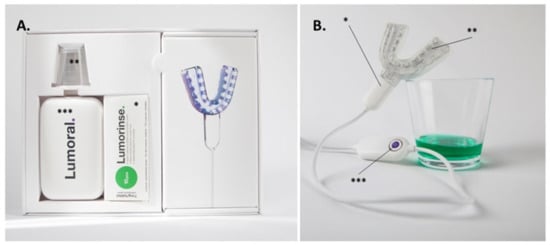 The dual-light aPDT Lumoral® device. (A) The device includes the Lumoral® light applicator and the effervescent Lumorinse® tablets (*) to be dissolved in 30 mL of water with a measuring cup (**). A power source (***) for the light applicator. (B). The mouthpiece (*) is composed of 48 LED components (**) assembled to provide simultaneous light on both the maxillary and mandibular dental arches. Each LED component emits 405 nm and 810 nm light simultaneously. A push of the control button provides a treatment time of 10 min (***). When dissolved, the ICG in the Lumorinse® tablet appears green.