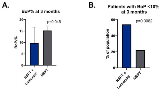 At the beginning of the study, the median BOP was 23.7% (range 8.0–48.5%) in the NSPT + Lumoral® group and 26.5% (range 13.2–53.8%) in the NSPT group, with no statistical difference between the groups. Both groups showed a reduction in BOP at the three-month visit, but the BOP in the NSPT + Lumoral® group was significantly lower (p = 0.045), with medians of 9.7% (range 2.8–34.5%) and 14.2% (range 5.6–35.9%), respectively. See Figure 3A. In the NSPT + Lumoral® group, 54% of the patients and 22% in the NSPT group reached BOP < 10% target (p = 0.02), see Figure 3B.