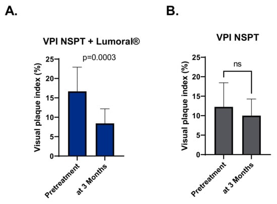 (A) VPI (%) in the NSPT + Lumoral® group at the beginning of the study and three months. (B) VPI (%) in the NSPT group at the beginning of the study and three months. VPI = visual plaque index, NSPT = non-surgical periodontal treatment.