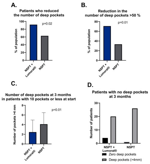 (A) Proportion of the patients who reduced the number of their deep periodontal pockets. (B) The number of patients with a reduction of 50% or more in the number of deep pockets at three months. (C) Number of deep pockets at three months in patients who had ten pockets or fewer at the beginning of the study. (D) The number of patients who presented no deep pockets at three months.