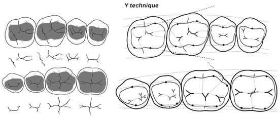 Figure 1 shows the stylization of the occlusion maps using the ‘Y technique’ for the posterior teeth, thus allowing the primary anatomy to be restored. The Y technique is a form of occlusal design memorization that uses a symbolic pattern to locate and map anatomical structures. The letter Y is inserted in different positions, dividing the tooth into its proper parts, arranging the anatomy in a stylized manner so that all the structures are positioned and the restoration is performed more efficiently. Although there are several anatomical variations among the same types of teeth, the occlusion map design hardly changes.