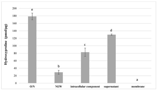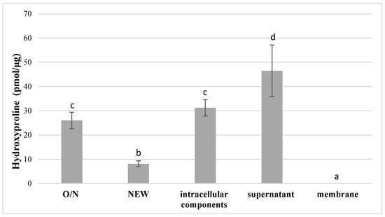 Hydroxyproline production after incubation of type I collagen with O/N and NEW S. mutans UA159 and its discrete fractions (n = 3; data are reported as mean ± standard errors). Different lowercase letters indicate statistically significant differences between the groups. Values with the same letters indicate non-significant differences (p > 0.05). O/N: overnight cultures; New: 1:100 fresh inoculated cultures.