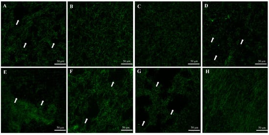 CLSM averaged images of autofluorescence of type I collagen gels incubated with (A) C. histolyticum collagenase (positive control), (B) PBS (negative control), (C) ¼ THYE medium (negative control), (D) O/N S. mutans, (E) NEW S. mutans, (F) intracellular components, (G) supernatant and (H) bacterial membrane. The arrows point out structural changes (loss of collagen fibrils).