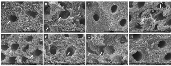 SEM images of dentinal collagen: (A) baseline of demineralized dentin (10% phosphoric acid for 18 h), incubated with (B) C. histolyticum collagenase (positive control), (C) ¼ THYE medium (negative control), (D) O/N S. mutans, (E) NEW S. mutans, (F) intracellular components, (G) supernatant and (H) bacterial membrane. The arrows point to significant structural disruption of dentinal tubules.