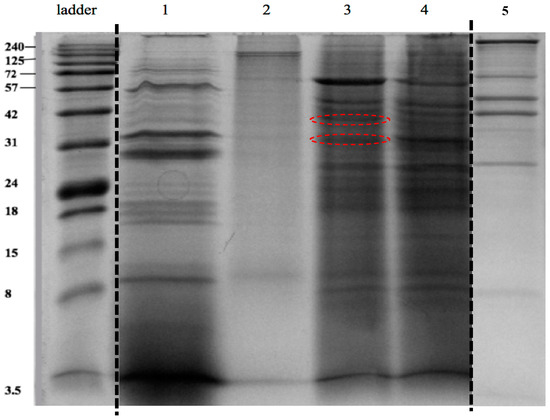Identification of the dentin collagen degradation products following digestion with the extracted intracellular proteins of S. mutans UA159. Lane 1: positive control (dentin collagen samples incubated with C. histolyticum collagenase); lane 2: negative control (dentin collagen samples incubated in PBS); lane 3 and 4: experimental groups (dentin collagen samples incubated in intracellular proteins at 37 °C for 2 weeks); lane 5: intracellular protein extracted from S. mutans (baseline control). Extra groups were cut off from the same gel image between the ladder and Lane 1; Lane 5 (baseline control) was regrouped from another gel. Red circles indicate the most distinct bands of interest from experimental groups.