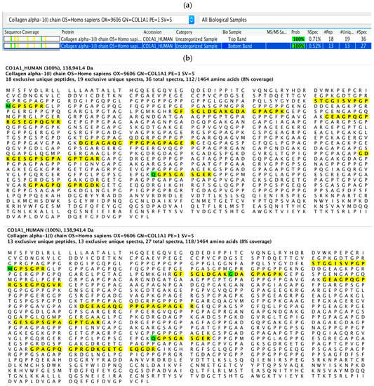 The media containing dentinal collagen degradation products from all groups were separated by gel electrophoresis. Collagen degradation products within the incubation media were verified by 15% sodium dodecyl sulfate-polyacrylamide gel electrophoresis (SDS-PAGE) as described previously [21]. The suspected collagen degradation fragments were present as bands on SDS-PAGE gels. The two most distinct bands of interest from experimental groups were collected, digested and analyzed by mass spectrometry as described previously [22] using LC-MS/MS (ThermoFisher LTQ, SPARC Biocentre at the Hospital for Sick Children, Toronto, ON, Canada). All MS/MS samples were analyzed using MS-Amanda Proteome Discoverer (Research Institute of Molecular Pathology, Vienna, Austria; version AmandaPeptideIdentifier in Proteome Discoverer 2.2.0.388).