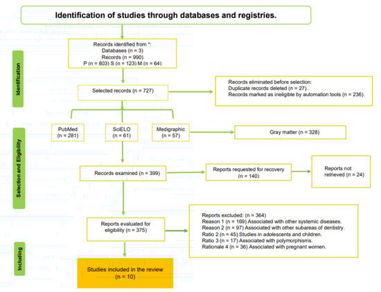 A total of 990 articles were found in the electronic search. Of these, 263 were eliminated before selection and marked as ineligible by automation tools because they were duplicate records. Subsequently, 328 articles were eliminated because they corresponded to thesis works, book chapters, memoirs, projects, among others. Furthermore, 399 articles were evaluated in abstract and titles, and 140 articles were requested for retrieval, 24 of which could not be retrieved. We were left to determine the eligibility of 375 articles, and 364 of them were excluded for different reasons. According to our selection criteria, 10 articles were included in the systematic review after a thorough evaluation. Figure 1 shows the PRISMA flow chart with the process of evaluation and selection of the chosen studies.