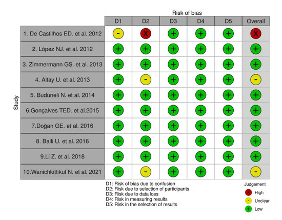 Seven studies (70%) had a low risk of bias, followed by two studies with an unclear risk (20%) and one study showed a high risk (10%) (Figure 2). The results obtained from the risk of bias analysis in the individual studies according to the evaluated domains are shown. The overall risk of bias was over 70%, with all the articles at low risk of bias (Figure 3). Given the results of the risk of bias analysis, the content of the selected articles was relevant for the development of the present review.
