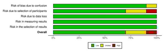 The Cochrane collaboration tool was used to assess the risk of bias in the selected studies, which includes the following domains: risk of bias due to confounding, risk due to participant selection, risk due to loss of data, risk in the measurement of results, risk in the selection of results and risk of general bias.