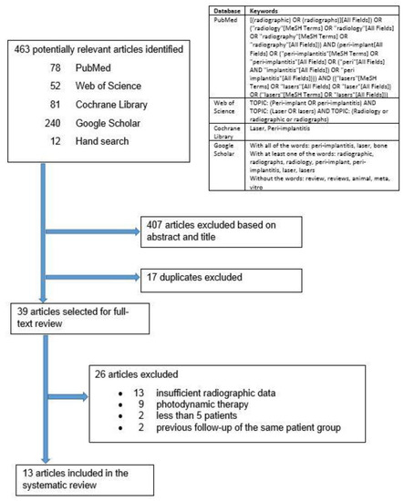- Clinical trials reporting radiographic effects of laser treatment on human peri-implant diseased periodontium were included.