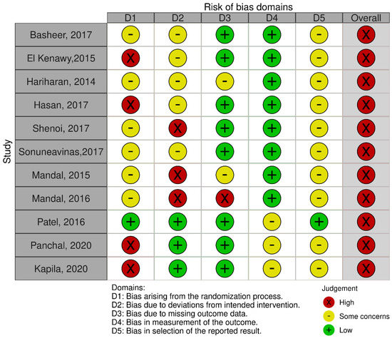 All trials were performed in India except for one, which was conducted in Iraq. The included studies were published between 2014 and May 2020, with the sample size ranging from 14 to 200. Five trials [16,17,19,20,25] used the split-mouth technique to compare between two groups, while six other studies [15,18,21,22,24] used the parallel group-randomization technique. The randomization method was computer-generated in four studies [18,21,22,23], coin tossing in four studies [17,19,20], and there were no details of randomization in three studies [15,16,24]. Three studies included extractions of canines and incisors, eight of premolars, and four of molars. Three studies included more men, two studies had more women, one study had equal gender distribution, and five studies did not mention gender distribution. Buccal cortical plate fracture (BCPF), amount of soft-tissue or gingival loss (GL), post-operative pain, time taken for extraction, and crown or tooth and root fractures were the most common outcomes measured in most of the studies, followed by soft-tissue healing after extraction. Other outcomes that were measured were bleeding, the ease of the technique, the volume of analgesics taken, bone loss, dry socket, and infections. All the trials had a high risk of bias. The risk of bias in individual studies is shown in Figure 2. The risk of bias across the included studies is shown in Figure 3.