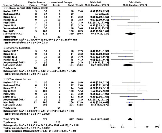 The results of the meta-analysis of adverse events are presented in Figure 4, organised into subgroups (BCPF, gingival laceration, and tooth or root fracture). Adverse events were statistically significantly lower with the physics forceps (n = 48) compared to with the conventional forceps (n = 120), with odds ratio 0.42 (0.25, 0.70), Z = 3.78 (p = 0.0002), and I2 = 21%. There was a significant difference in the incidence of GL (p = 0.04), and tooth or root fracture (p = 0.0009).