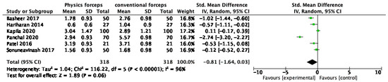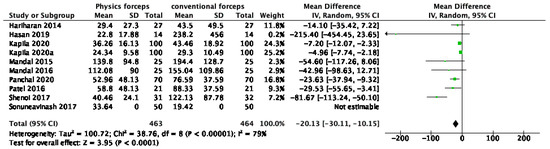 The meta-analytical results of operative time are presented in Figure 5. Operating time was statistically significantly lower in physics forceps than that in conventional forceps; mean difference (−20.13 (−30.11, −10.15)), Z = 3.78 (p = 0.0001), and I2 = 79%.