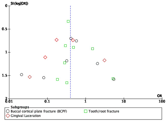 Meta-analysis of adverse events organised into subgroups (buccal cortical plate fracture, gingival laceration, and tooth or root fracture).