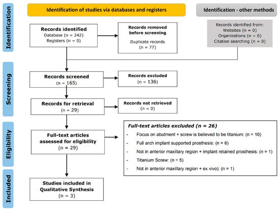Nonetheless, there are still concerns regarding the fracture resistance of zirconia, as standardized testing protocols addressing the aging behavior of zirconia implants have mostly focused on zirconia abutments, rather than the implant itself. Despite the fracture resistance of zirconia implants in in vitro studies being widely reported, there is a distinct lack of data derived from in vivo specifically human studies. Furthermore, Garcia-Hammaker et al. highlighted that the variability of in vitro study designs makes it difficult to have a consensus on the fracture strength and to correlate it to clinical circumstances []. As such, limitations on zirconia’s intended use in the clinical environment still exist, due to a lack of long-term clinical evidence of two-piece zirconia implants, as the technology has only been recently developed. Furthermore, the use of tooth-colored zirconia implants has been more prevalent in the anterior region of dentition, due to the aesthetic need of the patients. Therefore, the rationale for this systematic review was to clinically evaluate the factors influencing the fracture resistance of zirconia implants within the anterior region.