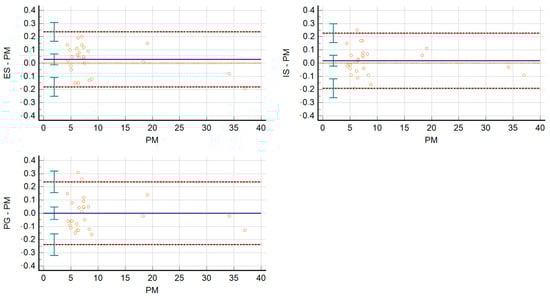 All the measurements made on the three digital models created using three different acquisition methods (PG, ES, IS), and the measurements made on the plaster model were imported to Microsoft Excel 2010®, and a database was created. The mean and SD in mm were calculated for each reference. The ICC was also calculated for each pair of measurements made on the plaster model (PM) and on each digital model created using the 3 different acquisition methods (PG, ES, IS). ICC was 0.99 for each pair of measurements. The Bland–Altman graphs created to determine the agreement between the measurements made on the three digital dental models compared to the measurements made on the plaster model are shown below (Figure 6).