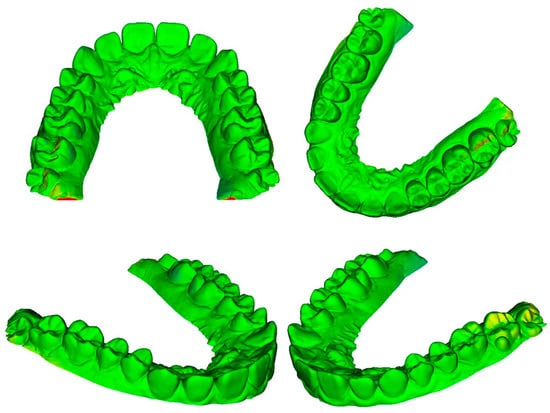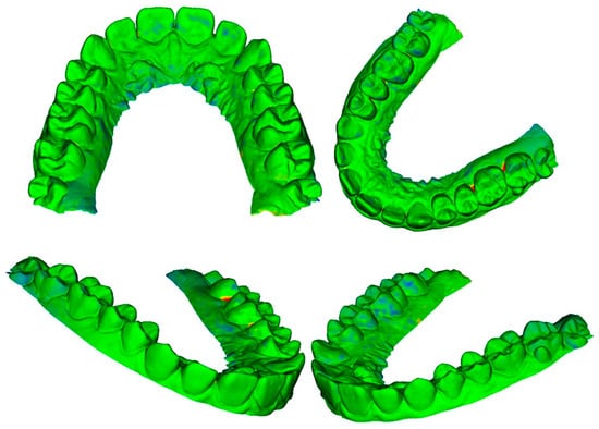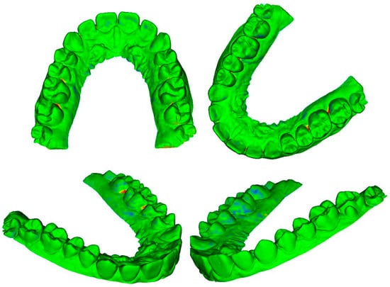 A volumetric study was performed on each pair of digital dental models and it was based on the analysis of the gaps present between the two meshes. The averages deriving from more than 100,000 values obtained as a point-by-point deviation from each pair of meshes denoted that they differed from each other, on average, by a maximum value of 31 μm. In the photogrammetric mesh, the vestibular area was characterized by greater precision of details than the palatal area. This might have been caused by the limited number of photographs of the palatal sector. Most of the photographs taken parallel to the occlusal plane portrayed only the vestibular part of the plaster model, while the palatal side, especially the mesio-palatal sector of the dental elements, was captured in a smaller number of images and only in those taken with the inclination of 30° from the occlusal plane. In these areas, greater gaps were noticed when the photogrammetric mesh was superimposed on the other two meshes. This lower precision in the palatal sector could be overcome by taking a greater number of photographs of the plaster model and by paying more attention to its palatal side.