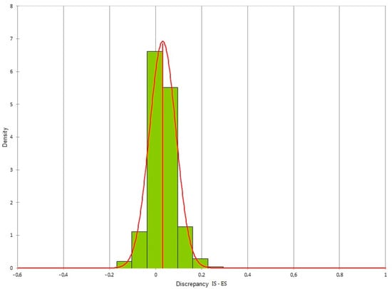 The two-way ANOVA test was performed on all the values obtained from the measurements of the plaster model and of the three digital models obtained using PG, IS and ES. The test was not statistically significant, with a p-value = 0.20, showing no differences between the four methods of acquisition in terms of reproducibility. The three digital dental models created using the three different acquisition methods were superimposed according to a Surface Registration algorithm. For each pair of models, all the distances present between the two models were exported. From the volumetric analysis, more than 100,000 distances were exported (representing the difference between the two meshes). For each pair of digital dental models, these distances were distributed in a normal way and histograms were created for each pair of meshes. For the various superimpositions, the mean ± SD (mm) of the differences between the two meshes were:
