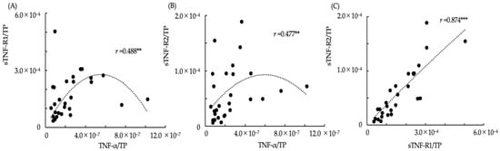 The relationships between TNF-α/TP, sTNF-R1/TP, and sTNF-R2/TP in saliva. (A) The relationship between TNF-α/TP and sTNF-R1/TP in saliva (r: Spearman’s rank coefficient, ** p < 0.01); (B) The relationship between TNF-α/TP and sTNF-R2/TP in saliva (** p < 0.01); (C) The relationship between sTNF-R1/TP and sTNF-R2/TP in saliva (*** p < 0.01). The dotted lines show approximation curves (quadratic curve model, (A) r2: 0.155; (B) r2: 0.155; (C) r2: 0.753, p < 0.001).