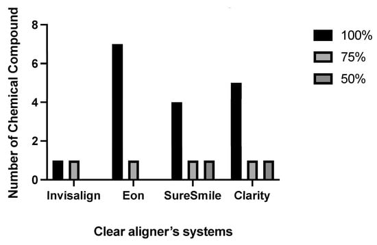 Leaching was confirmed from the different systems at variable immersion solution concentrations (Table 2). Furthermore, only the Eon® system showed statistically significant differences when comparing the number of leached substances among the immersion solution concentrations (Table 3). Seven different leached chemical compounds were observed in a 100% immersion solution of the Eon® system compared to a single material in 75% (benzene), and no leaching was observed in 50% ethanol. The number of leached chemicals was statistically insignificant in Invisalign®, SureSmile®, and Clarity®, regardless of the immersion solution concentration. No traces of BPA were detected among all the studied clear aligner systems.