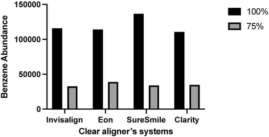 Benzene1,3-bis(1,1-dimethylethyl) was the only compound detected in all four systems at the levels of 100% and 75% ethanol. The 50% ethanol presented Phenol, 3,5-bis(1,1-dimethylethyl), in the SureSmile® and Clarity® systems with high percentages of 95% and 94%, respectively (Table 1). The abundance of leached benzene was detected at higher levels, at 100% ethanol compared to 75%, with all systems reporting similar amounts. SureSmile® was the highest system with regard to benzene abundance at 100%, while Eon® was the highest at 75% (Figure 2).