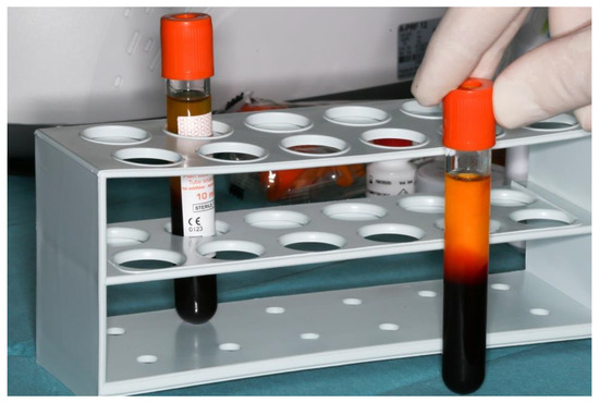 In the meantime, a temporary liquid PRF preparation following the i-PRF protocol was carried out [30]. Two i-PRF-vacutainers (Process for PRF, Nice, France) of the patient’s venous blood were collected by utilizing a 21 g needle with a butterfly handle and a vacutainer matching pump body (BC12 retractable blood sampler, Process for PRF, Nice, France). Prompt handling and speedy processing was assured (700 rpm, 3 min centrifugation time for women, 4 min centrifugation time for men because of a different hematocrit) by a dental assistant utilizing a provided centrifuge (DuoQuattro, Process for PRF, Nice, France) (Figure 1).