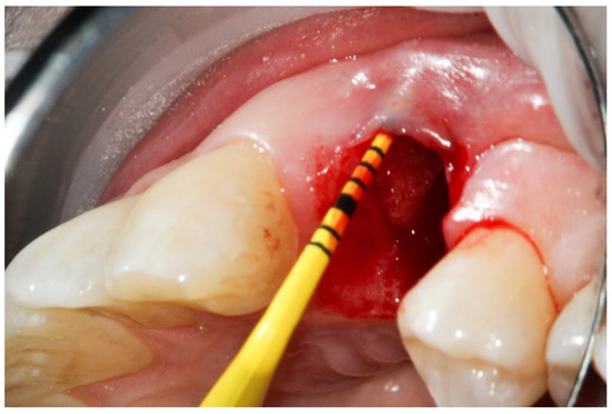 The teeth had various indications for extraction (Table 1), but in all sockets the same alveolar ridge preservation protocol was applied. Multirooted teeth were separated by utilizing a small rotating Lindemann bur (H162AZ, Komet, Gebr. Brasseler GmbH; Lemgo, Germany), and the root fragments were elevated and removed with the help of matching periotomes (PT Periotomes, Hu Friedy, Chicago, IL, USA) as gently and atraumatic as possible, under local anesthesia (Ultracain DS forte, Sanofi, Paris, France). Calculus, carious lesions, remnants of the periodontal ligaments and enamel as well as restorations and any other artificial materials were removed with fast rotating carbide burs (H35L.314.012, Komet, Gebr. Brasseler GmbH; Lemgo, Germany) and curettes (Langer 3-4, American Eagle XP, American Eagle Instruments Inc., Missoula, MT, USA). The extraction socket was inspected and classified as proposed by Elian et al. in 2007 (Table 1) [29].
