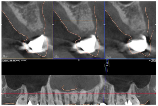 A healing time of at least 15 weeks was intended to provide a solid implant site. A presurgical assessment of the alveolar ridge was conducted by CBCT (Orthophos XG 3D, Dentsply Sirona, York, PA, USA) also to facilitate flapless surgery by fabricating a static computer-aided implant surgery template (Figure 6).