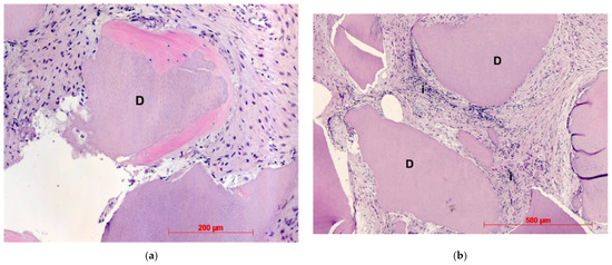 (a): Patient 7—Early-stage osteogenesis around dentin granule (D), HE, original magnification ×20. (b): Patient 7—Dentin granule (D) remnant embedded into newly formed bone, HE, original magnification ×20.