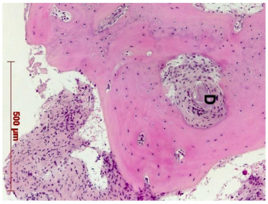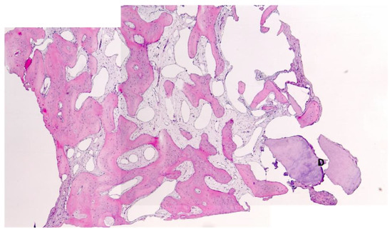 Patient 1—Dentin granule (D) embedded into newly formed bone, HE, original magnification ×20.