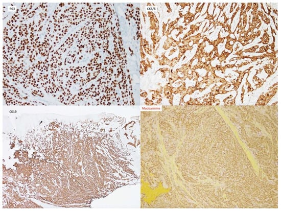 Immunohistochemistry was diffusely positive for p63 (100×), CK5/6 (100×), CK19 (40×) and negative for mucicarmine (100×).