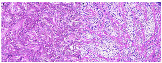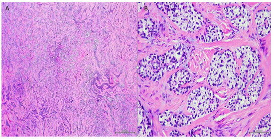 H&E, uncircumscribed neoplastic odontogenic epithelial proliferation, diffusely infiltrating the connect tissue stroma (A, 40×). The neoplastic proliferation formed islands of variable size, trabeculae, and nests exhibiting central pleomorphic and hyperchromatic nuclei surrounded by clear cytoplasm (B, 200×).