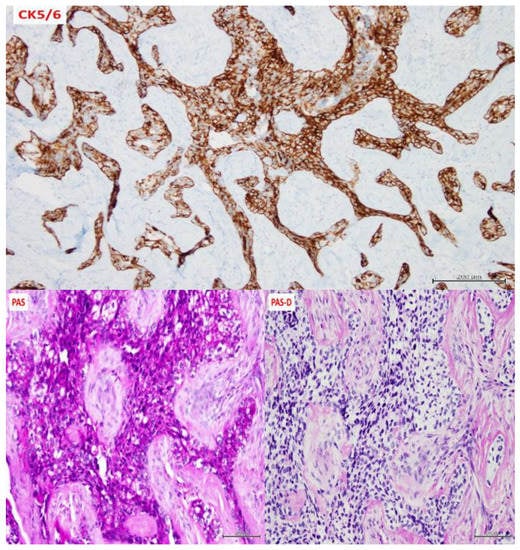 Case 2 immunohistochemistry was diffuse and strongly positive for CK5/6 and PAS- stain which was diastase-labile (200×).