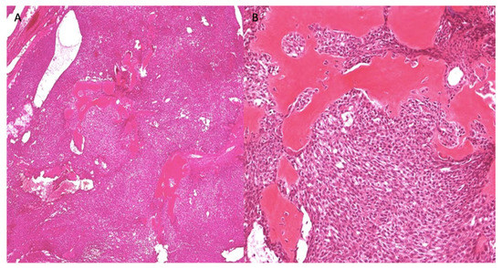 H&E, Infiltrative odontogenic epithelial neoplasm intermixed with eosinophilic dentinoid matrix. Neoplastic proliferation surrounded by reactive cellular osseous trabeculae with osteoblastic rimming (100× (A) and 200× (B)).