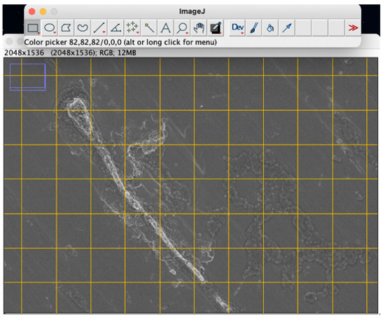 All surfaces were randomized blinded and independently analyzed by two microscopy experts with ImageJ (v1.50, US National Institutes of Health, Bethesda, MD, USA) and the “Grid Overlay” plugin which created a grid with cross points 11 × 7 (Figure 1). At each crossing point, it was assessed whether microbes were present in the contaminated and decontaminated surfaces. In the surfaces where the growth of fibroblasts had been carried out, the presence of cells at the crossing points was assessed. The results for each grid have been reported as a percentage to allow a homogeneous statistical survey.