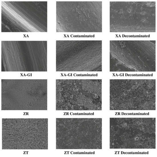 Micrographs of the sterile, contaminated by plaque and decontaminated XA, XA-GI, ZR and ZT surfaces.