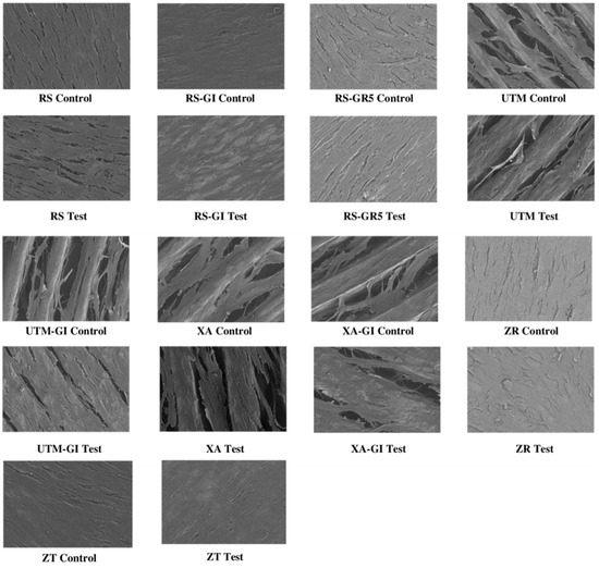 Micrographs of the sterile, contaminated by plaque and decontaminated RS, RS-GI, RS-GR5, UTM and UTM-GI surfaces.