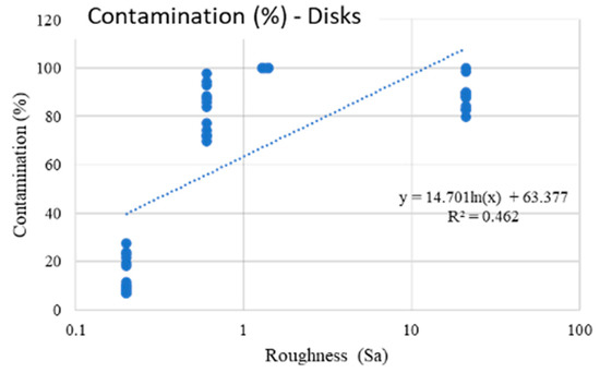 The present scheme indicates that the roughness has a very high influence on the bacterial contamination. When roughness increases over Sa 0.60, it is possible to observe a saturation process (values around 90–100% are reached).