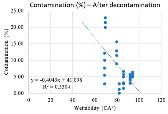 ZT and ZR surfaces remain highly contaminated (100%) even after treatment. If the ZT and ZR discs are excluded, there is a tendency of the material to decontaminate better in case of high wettability.